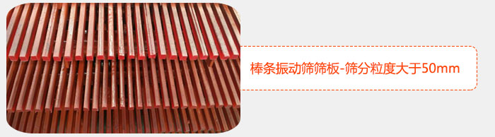 棒條振動(dòng)篩篩板是由一組平行排列的、具有一定斷面形狀的鋼棒組成。棒條平行排列,棒條之間的間隔即為篩孔尺寸。棒條篩面一般用于固定篩或重型振動(dòng)篩,適于篩分粒度大于50mm的粗粒級(jí)物料。